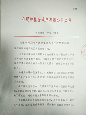 近日,由同济公司承建的湖光别院A地块南区总包工程项目部收到业主单位合肥和桂房地产有限公司发来的表扬信(和桂房字2018002号文),对湖光别院项目部团队质量管理工作给予了充分肯定,对同济公司领导高度重视该项目的进展情况表示感谢。