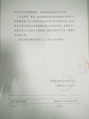 信中指出,面对工期紧、施工现场条件复杂、施工难度大等不利因素,同济公司领导多次亲临现场指导工作,同济公司湖光别院A地块南区工程项目部迎难而上,发挥攻坚不畏难的精神,协调各方、解决技术难题、组织分配劳务资源,保质保量完成了该项目的预售节点目标任务。