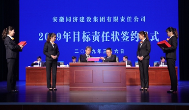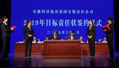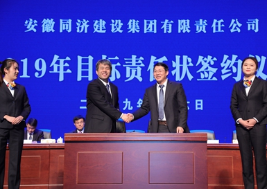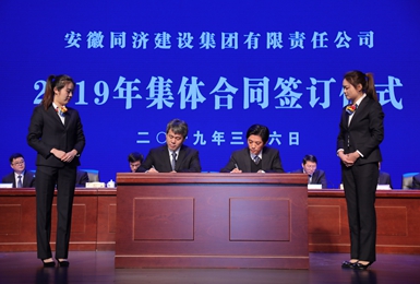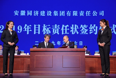 工会主席刘长丰签订同济集团2019年集体合同 会上,吴晓东代表董事会与安全管理中心、经营管理中心、同济路桥公司以及德渡机械公司四个单位代表签订了2019年目标责任状,与工会主席签订了2019年集体合同。