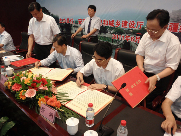 新疆维吾尔族自治区城乡建设厅厅长张鸿、省住房建设厅厅长李明签署合作协议
